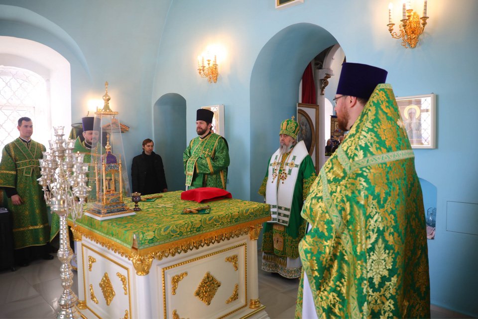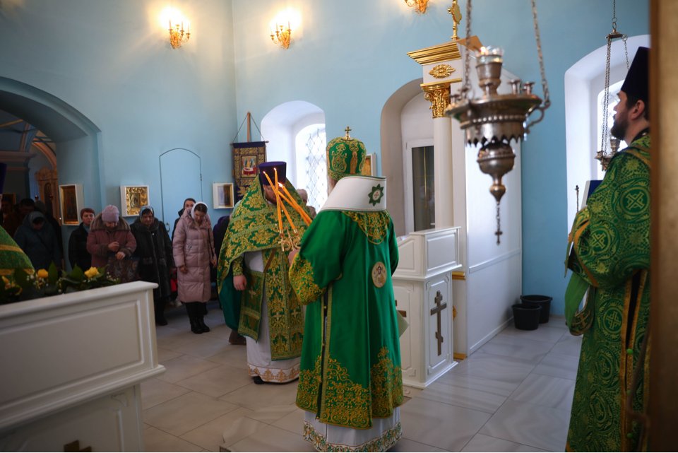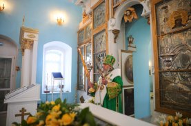 По заамвонной молитве было совершено славление перед ковчеком с частицей мощей блаженной Матроны Себинской и Московской. Далее владыка обратился к духовенству и прихожанам со словом о блаженной старице Матроне.