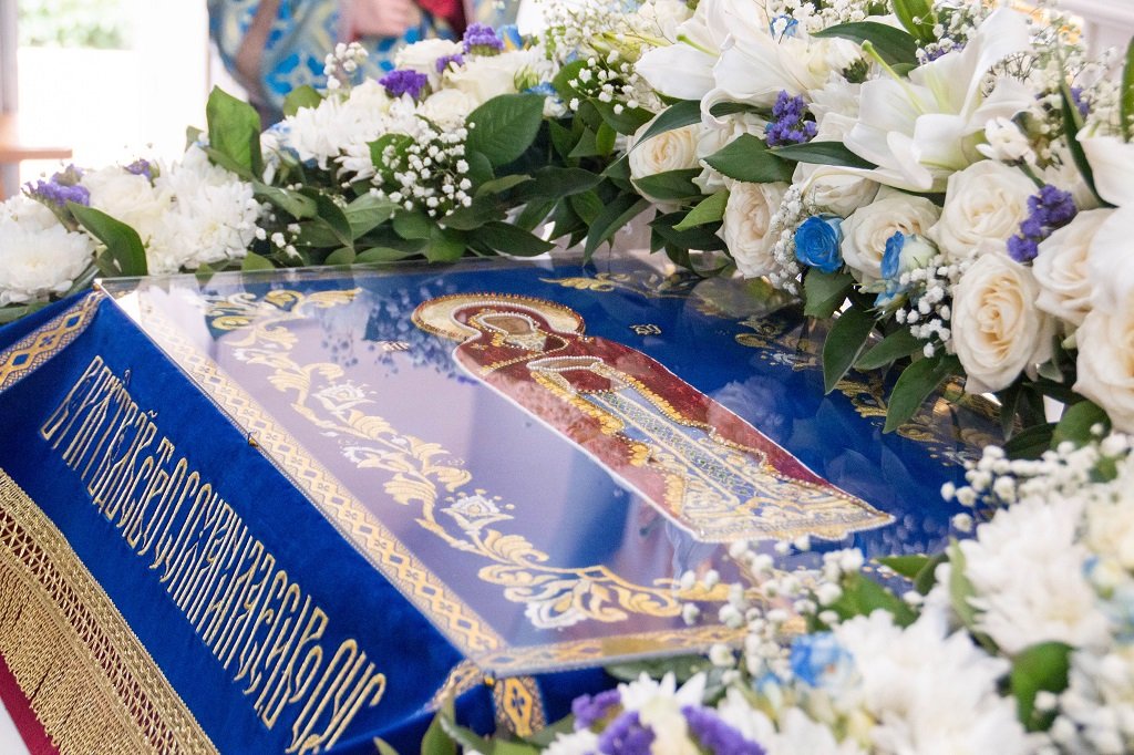 На полиелее из алтаря была изнесена и размещена в центре храма на специально уготованном месте Плащаница Пресвятой Богородицы.
